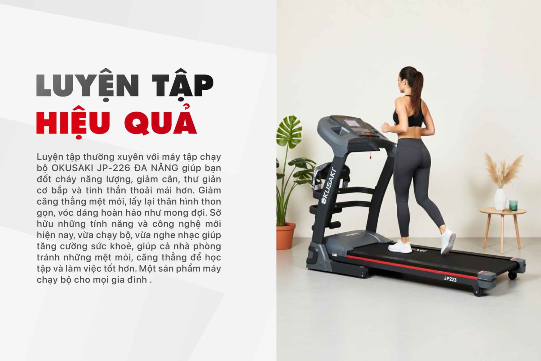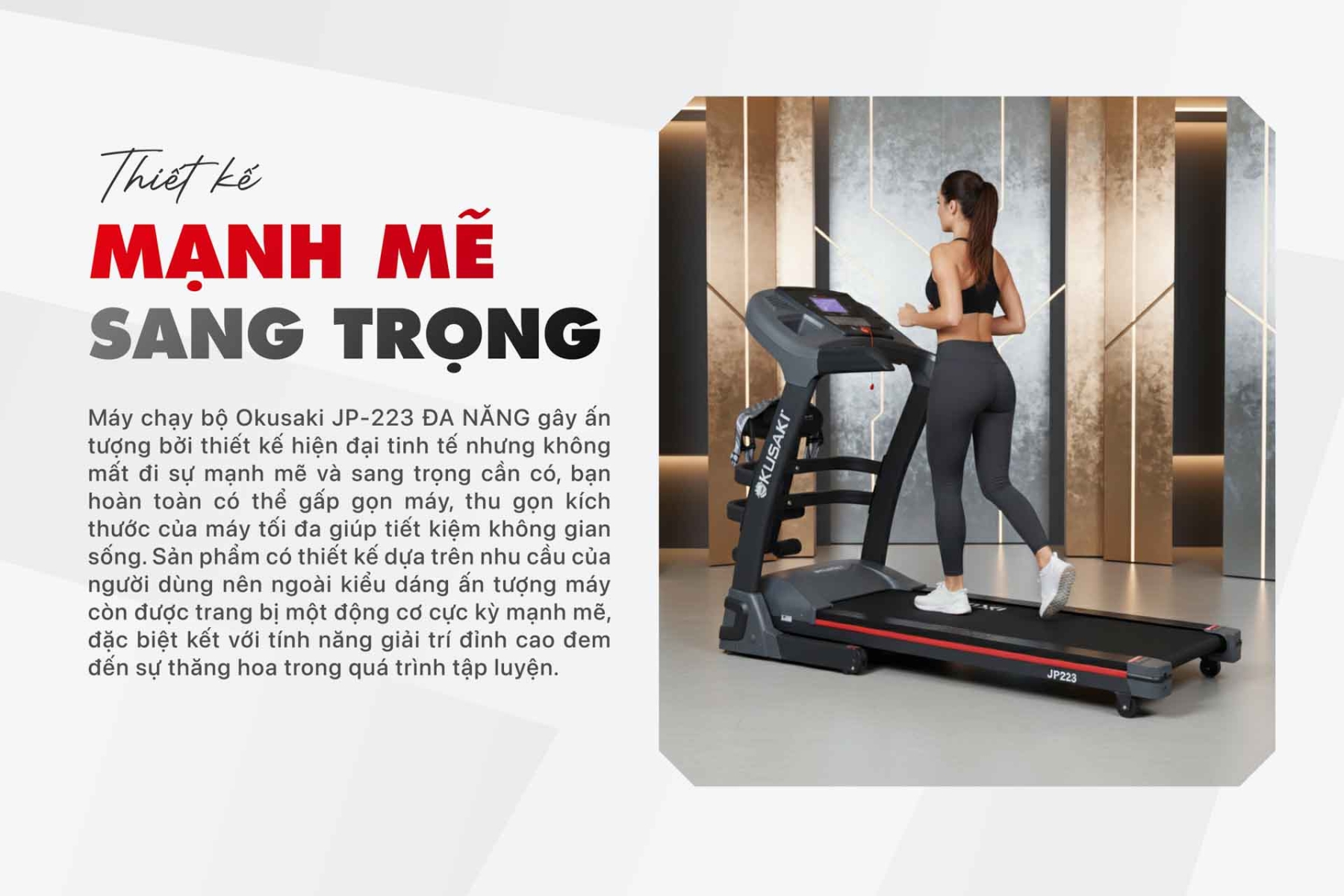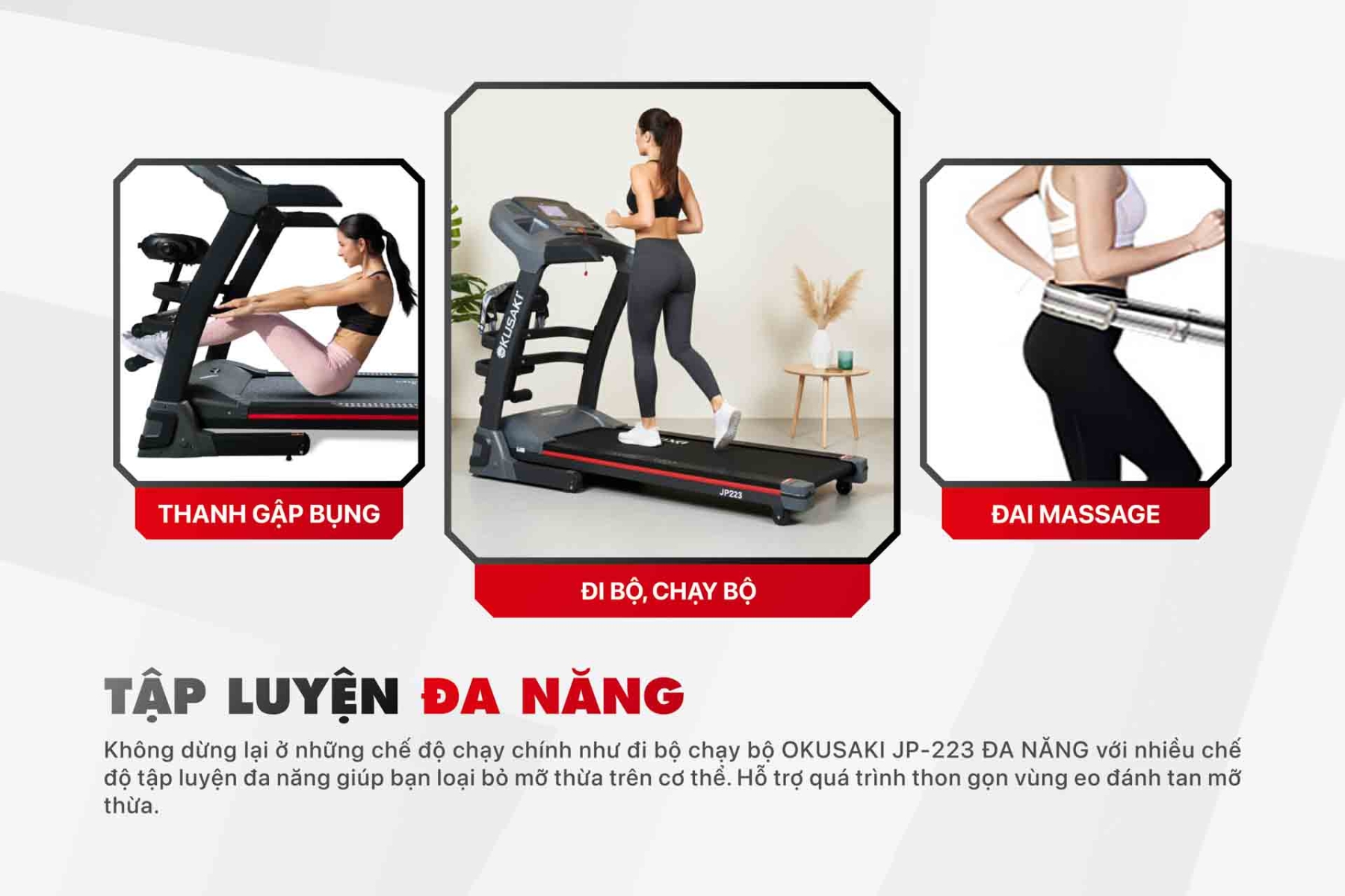 Máy chạy bộ đa năng JP-223 là dòng máy chạy bộ bán chạy nhất tại Okusaki được rất nhiều người tin tưởng và lựa chọn. Tuy nhiên, để quý khách có thể sử dụng máy một cách dễ dàng và cho hiệu quả tốt nhất. Bài viết này Okusaki sẽ hướng dẫn bạn sử dụng máy chạy bộ JP-223 nhé