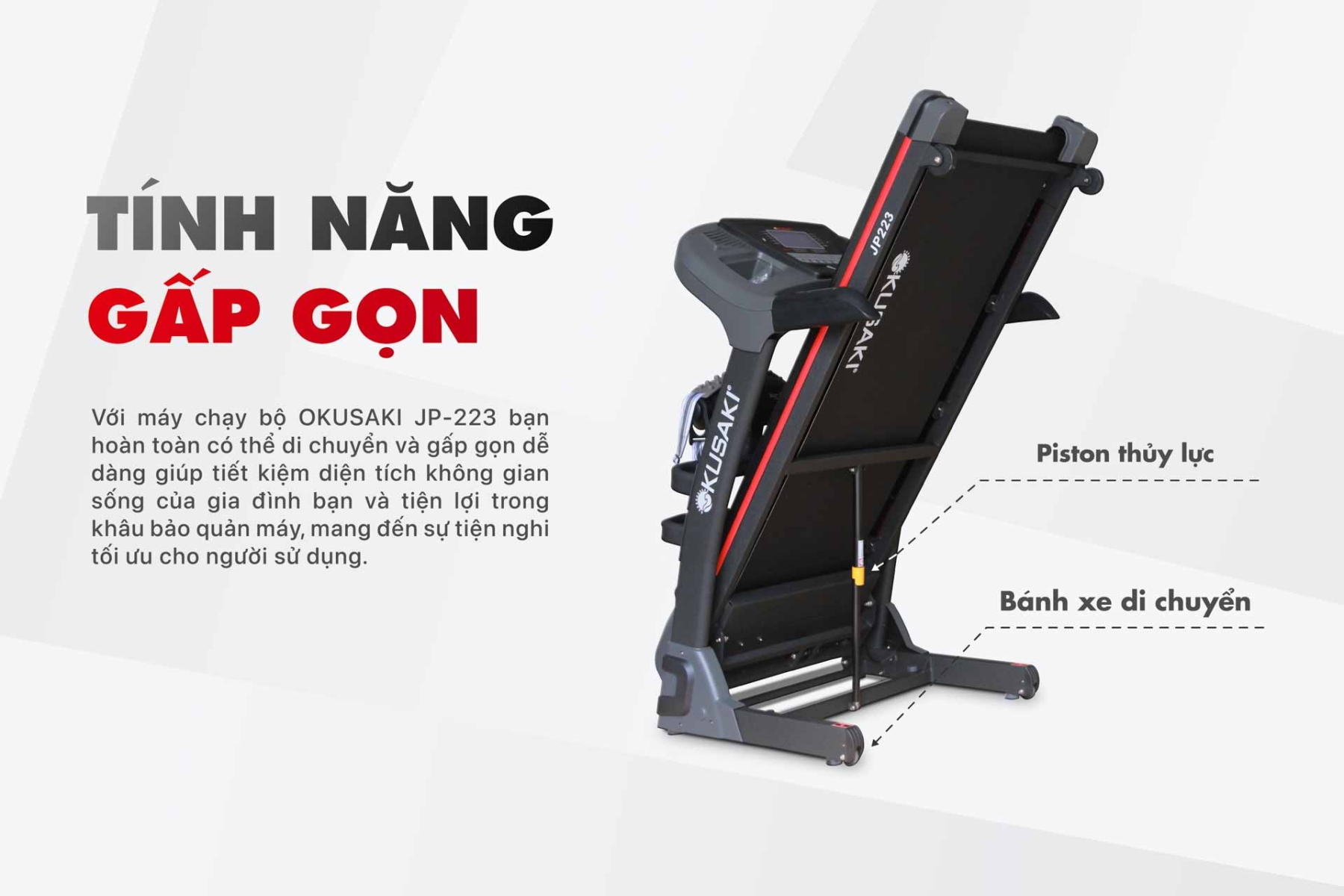 Máy chạy bộ đa năng JP-223 với nhiều tính năng vô cùng hữu ích chắc chắn sẽ mang đến cho bạn những trải nghiệm vô cùng tuyệt vời. Để quý khách hàng hiểu rõ hơn về máy chạy bộ JP-226 Plus hôm nay Okusaki sẽ hướng dẫn bạn cách sử dụng, vệ sinh và bảo dưỡng máy chạy bộ JP-223 một cách chi tiết nhất nhé!