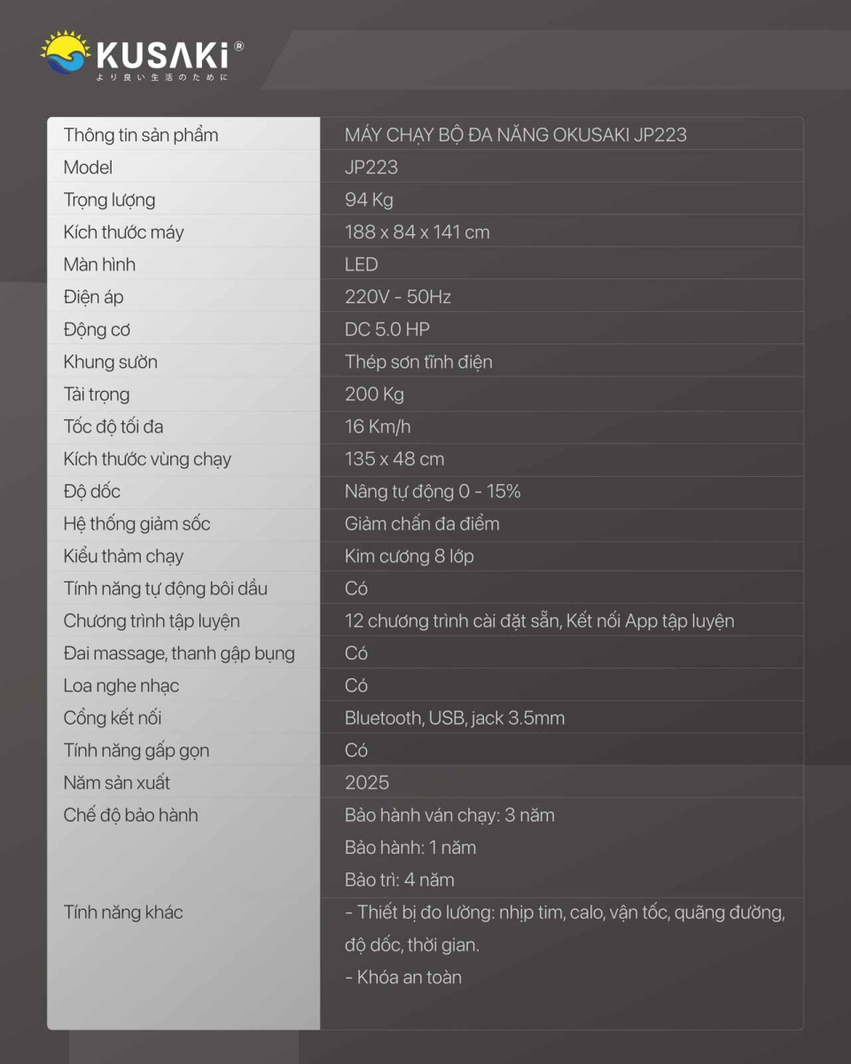 Trên đây là chi tiết cách sử dụng, vệ sinh và bảo dưỡng máy chạy bộ JP223 luôn bền, mới và hoạt động trơn tru. Trong quá trình sử dụng nếu có bất kỳ thắc mắc hoặc gặp sự cố gì cần sửa chữa và bảo hành máy chạy bộ vui lòng liên hệ ngay với Okusaki theo Hotline 19000.55526 để được hỗ trợ nhanh nhất.