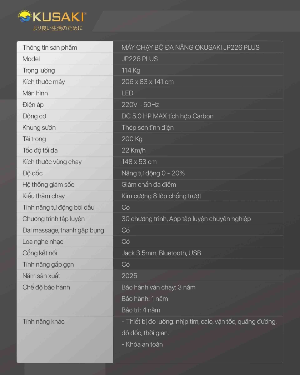 Okusaki JP-226 Plus không chỉ là một thiết bị tập luyện, mà còn là “trợ thủ đắc lực” giúp bạn duy trì lối sống lành mạnh và cải thiện sức khỏe toàn diện. Đây là sản phẩm dành cho những ai muốn sở hữu một chiếc máy chạy bộ toàn diện, không chỉ mạnh mẽ mà còn thông minh và tiện lợi.